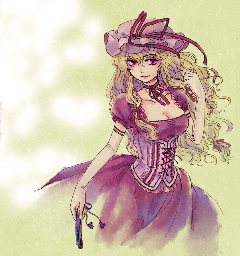 1girlblonde hairbreastschokercleavagecollarbonecorsetelbow gloveseyelashesfemale focusfolding fangloveshand fanhathat ribbonlipslong hairmakeuppurple eyesred eyesribbonribbon chokersmilesolo