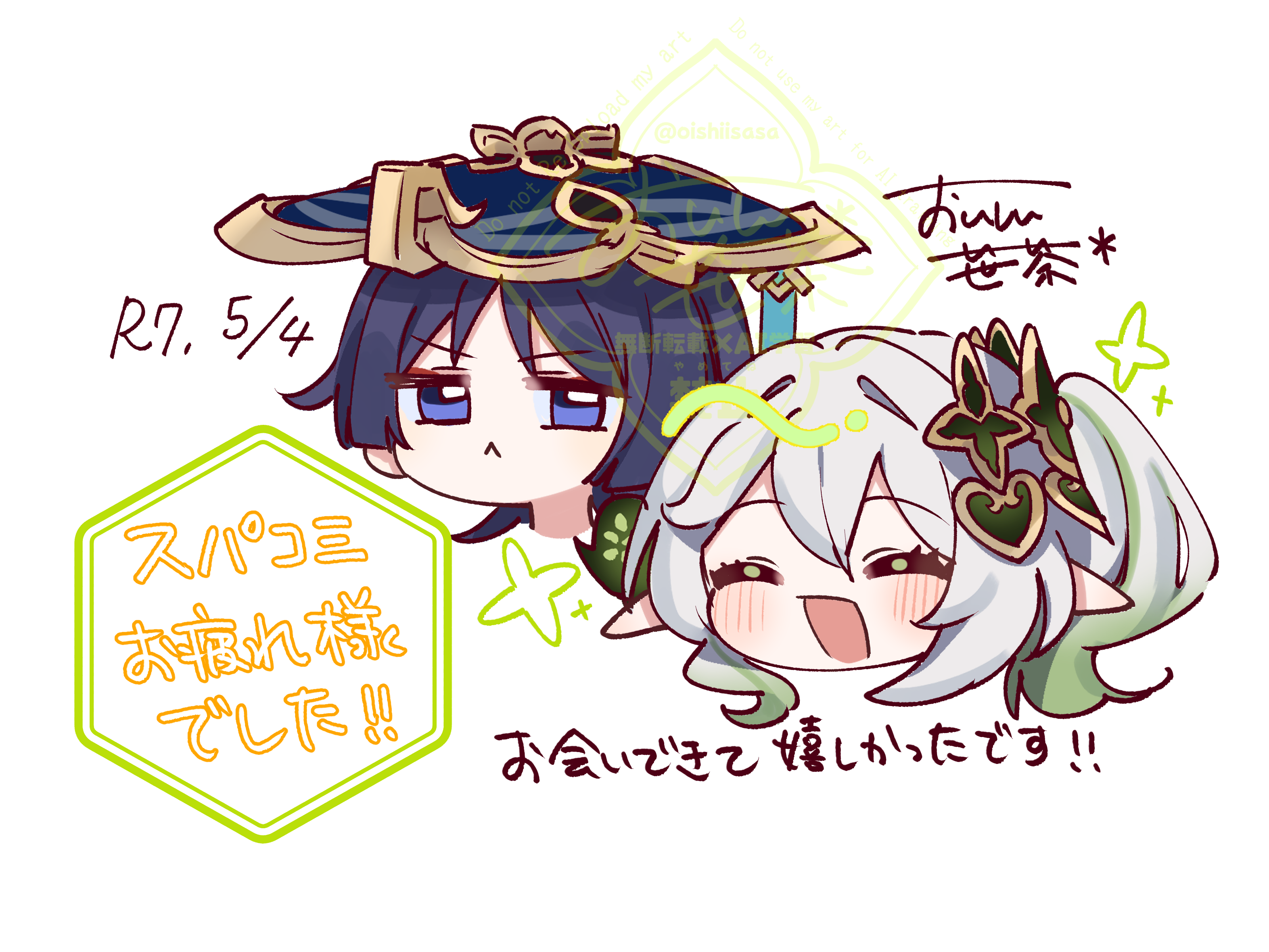 1boy1girlblue hatblushclosed eyesclosed mouthcropped headdateddisembodied headdouble-parted bangseyelasheseyelinereyeshadowfacing to the sidegoldgreen hairhair between eyeshair intakeshair ornamenthatjingasaleafleaf hair ornamentlong hairlooking at viewermakeupmulticolored hairopen mouthpointy earspurple eyespurple hairred eyelinerred eyeshadowside ponytailsidelocksstreaked hairtwitter usernamewatermarkwhite backgroundwhite hairwispy bangs
