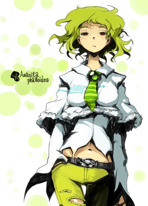 1girlbeltfemale focusgreen hairmidriffmushroomnecktiepersonificationred eyesshort hairsolotorn clothes