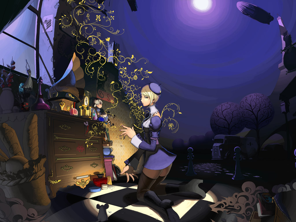 beretblonde hairboard gamebootschesseiffel towerhatkneelingmoonmouse (animal)nightphonographshort hairsolothighhighszettai ryouiki