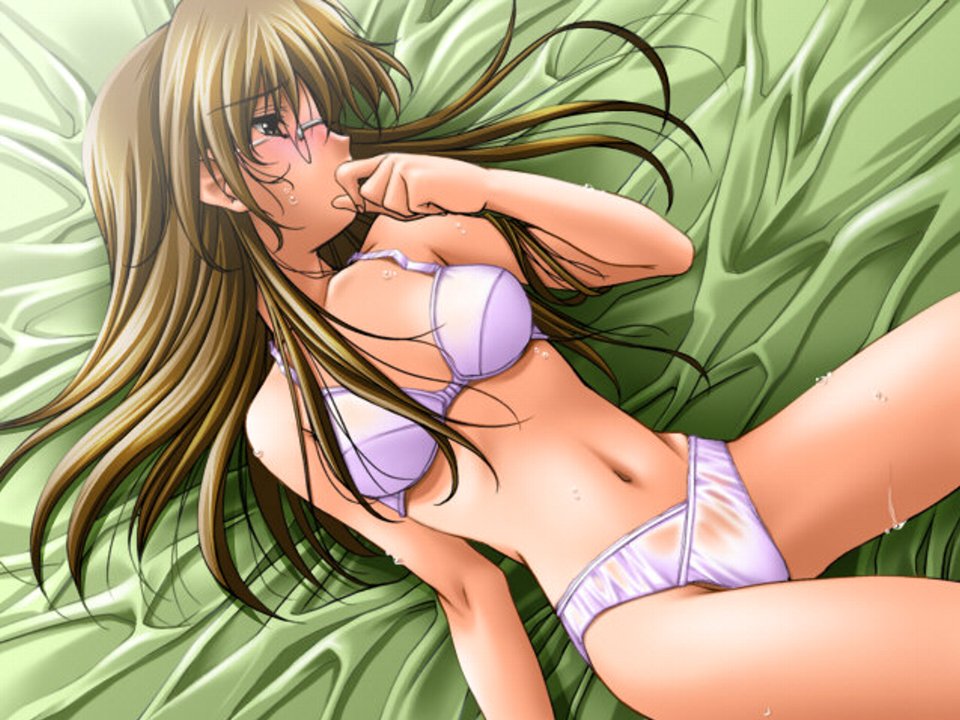 1girlblack eyesblushbrabrown hairfemale focusglasseslingerielyingpantiessolosweatunderwearunderwear only