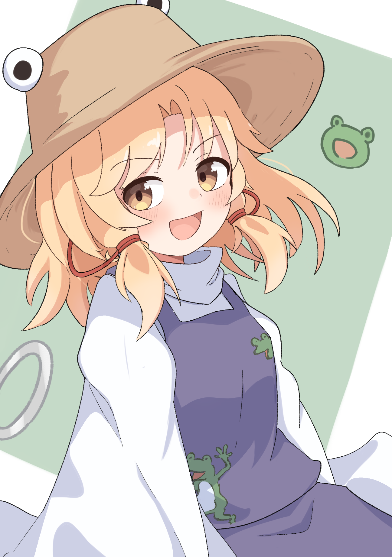 1girlanimal printblonde hairblushbrown hatfrog printhair ribbonhatlong hairlong sleeveslooking at viewermoriya's iron ringsopen mouthpurple skirtpurple vestred ribbonribbonskirtskirt setsmilesolotress ribbonvestwide sleevesyellow eyes
