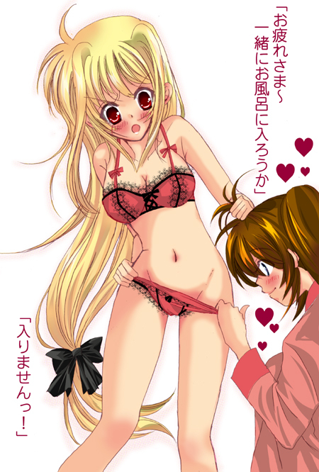 00s2girlsblonde hairblushfemale focusgrabbing another's hairholding another's hairlingerielong hairlow-tied long hairmultiple girlspantiespanty pullred pantiestext focusunderwearunderwear onlyyuri