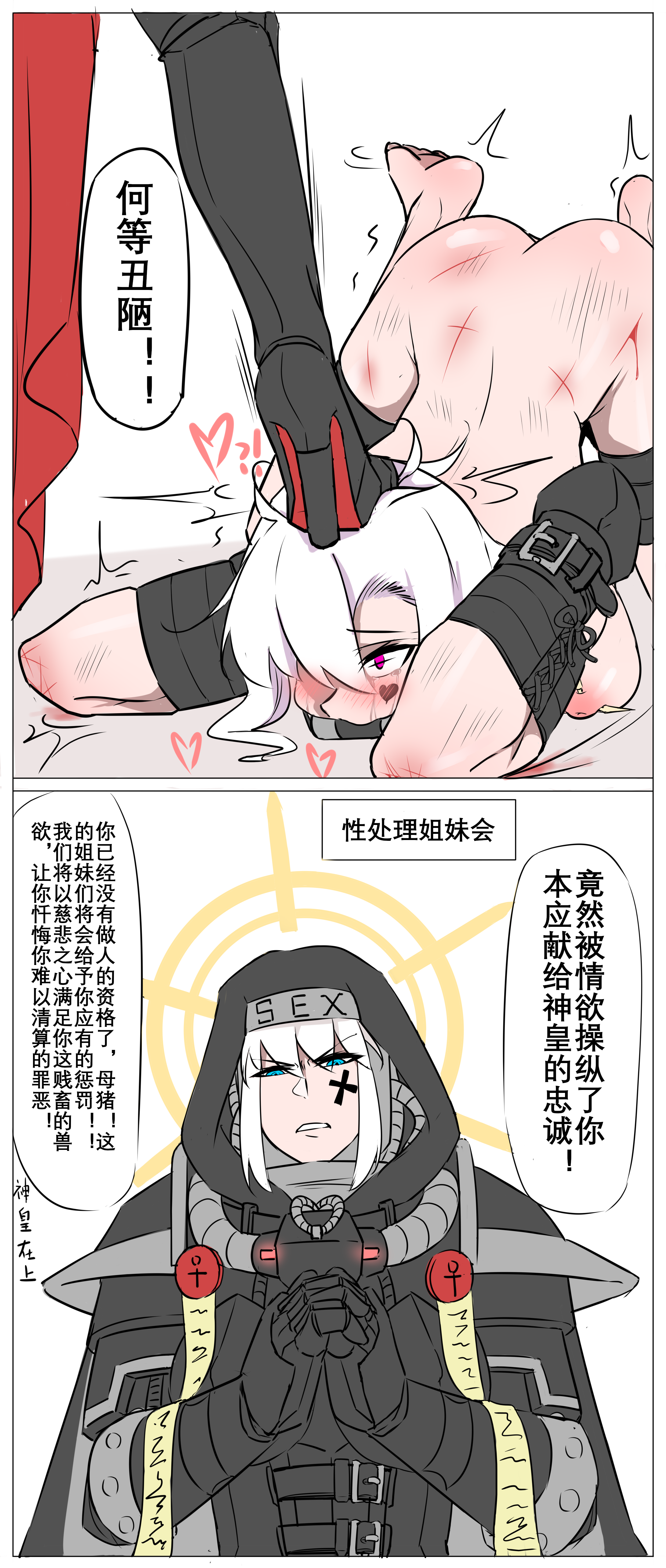 1boy2girlsarmorblushboundbreastsbruisechinese textcutsgaggedhalohearthigh heelsinjurymultiple girlsnipple piercingnipplesnudepiercingprayingrestrainedsimple backgroundstepped ontied up (nonsexual)white background