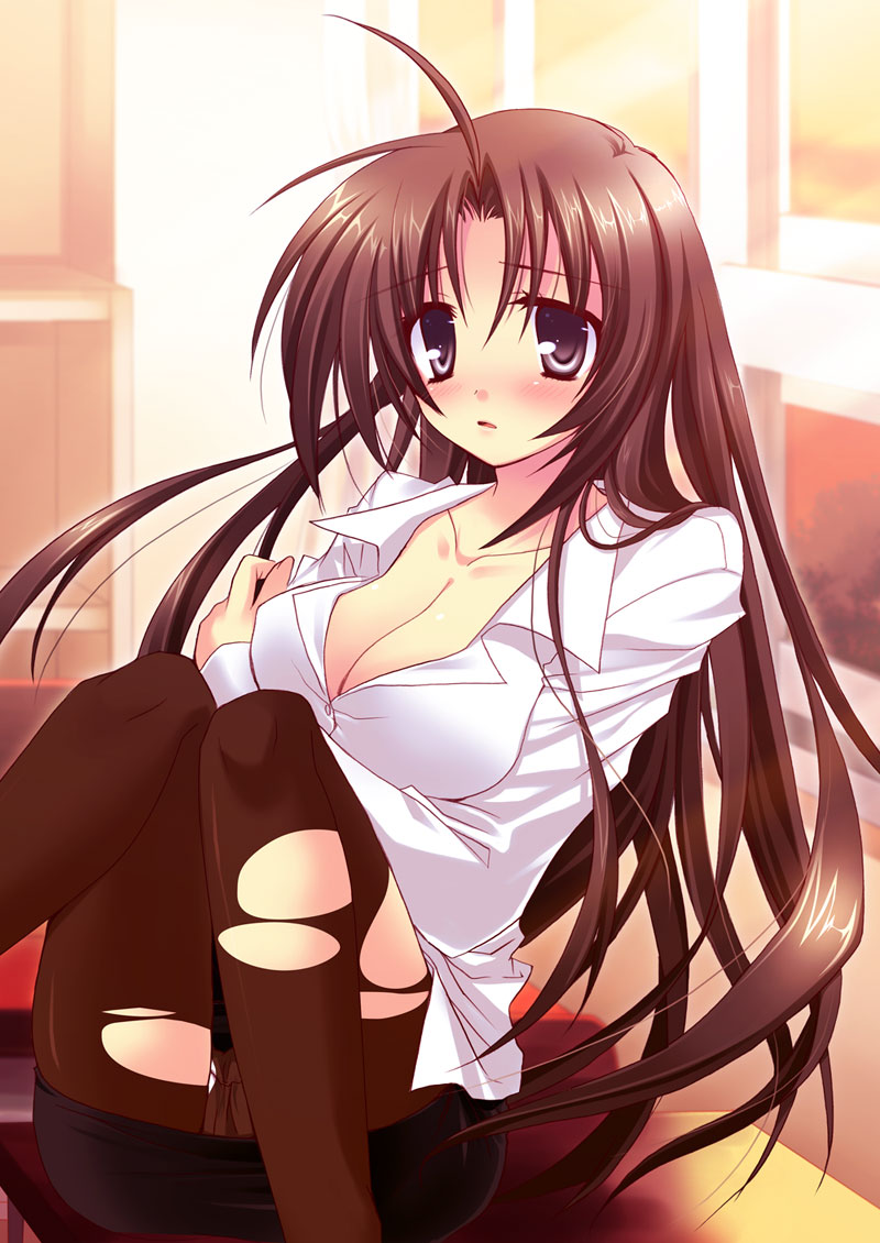 1girlahogebreastsbrown haircleavagefemale focuslarge breastslong hairminiskirtpantiespantyhosepencil skirtpurple eyesskirtsolotorn clothestorn pantyhoseunderwearupskirtwhite panties