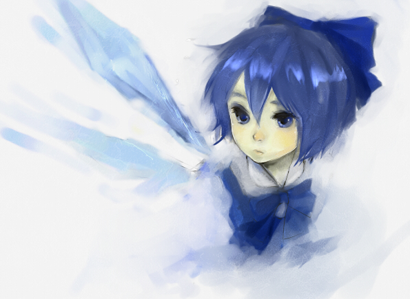 1girlblue eyesblue hairfemale focusgradient backgroundmatching hair/eyesribbonsoloupper bodywhite background