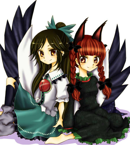 2girlsanimal earsblack hairbraidcat earscat girlcat taildressfemale focuslong hairmultiple girlsred eyesred hairribbontailwhite backgroundwings