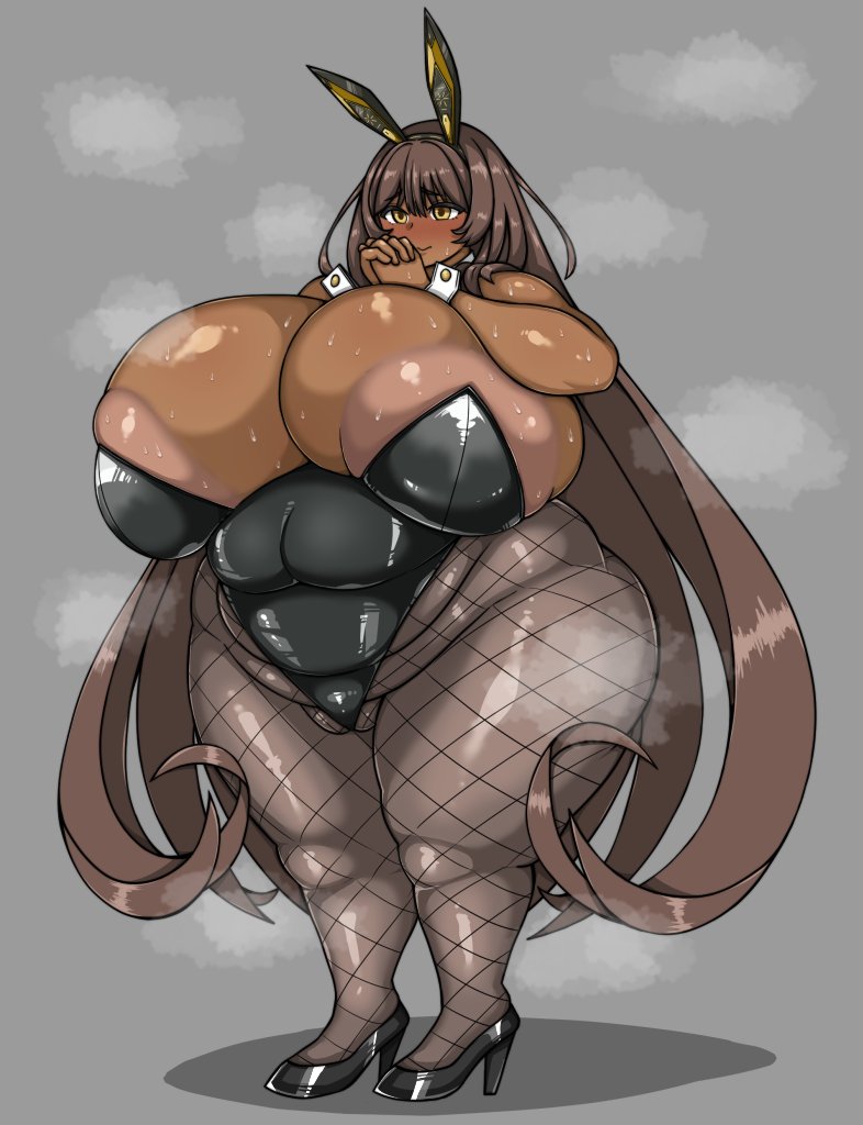 1girlanimal ear hairbandanimal earsareola slipblack hairbandblack leotardblack pantyhoseblack shoesblushbreastsbrown haircameltoecleavagedark skindark-skinned femalefake animal earsfatfat womanfishnet pantyhosefishnetsgigantic breastsgrey backgroundhairbandhands on own chesthigh heelsinterlocked fingersleotardlong hairpantyhoseplayboy bunnyrabbit ear hairbandrabbit earsshoessmilesolostandingsteaming bodysweatthick thighsthighsvery long hairwide hipswrist cuffsyellow eyes