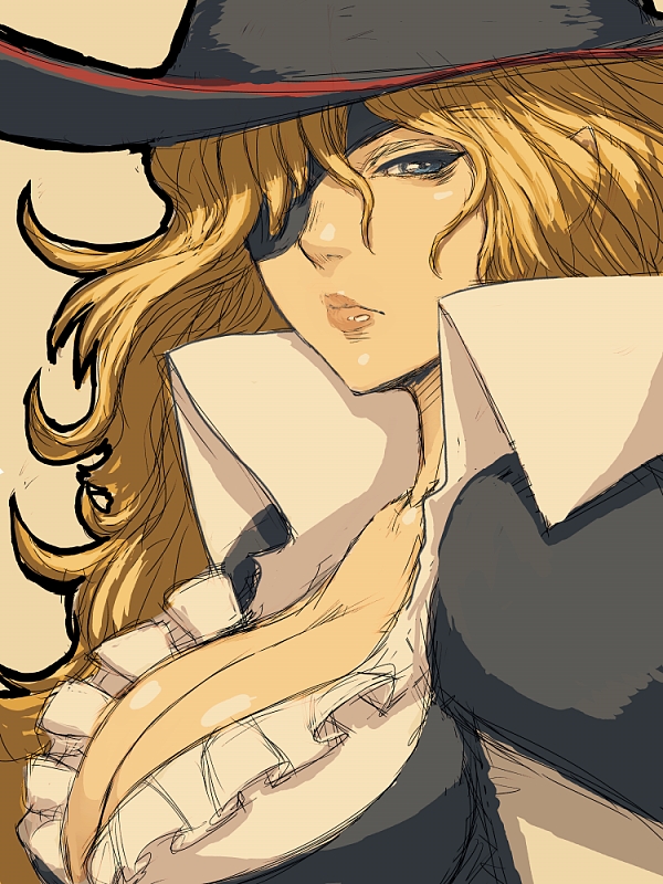 1girlblonde hairblue eyesbreastscleavageeyepatchfemale focusfrillshathuge breastslipslong hairpiratesolo