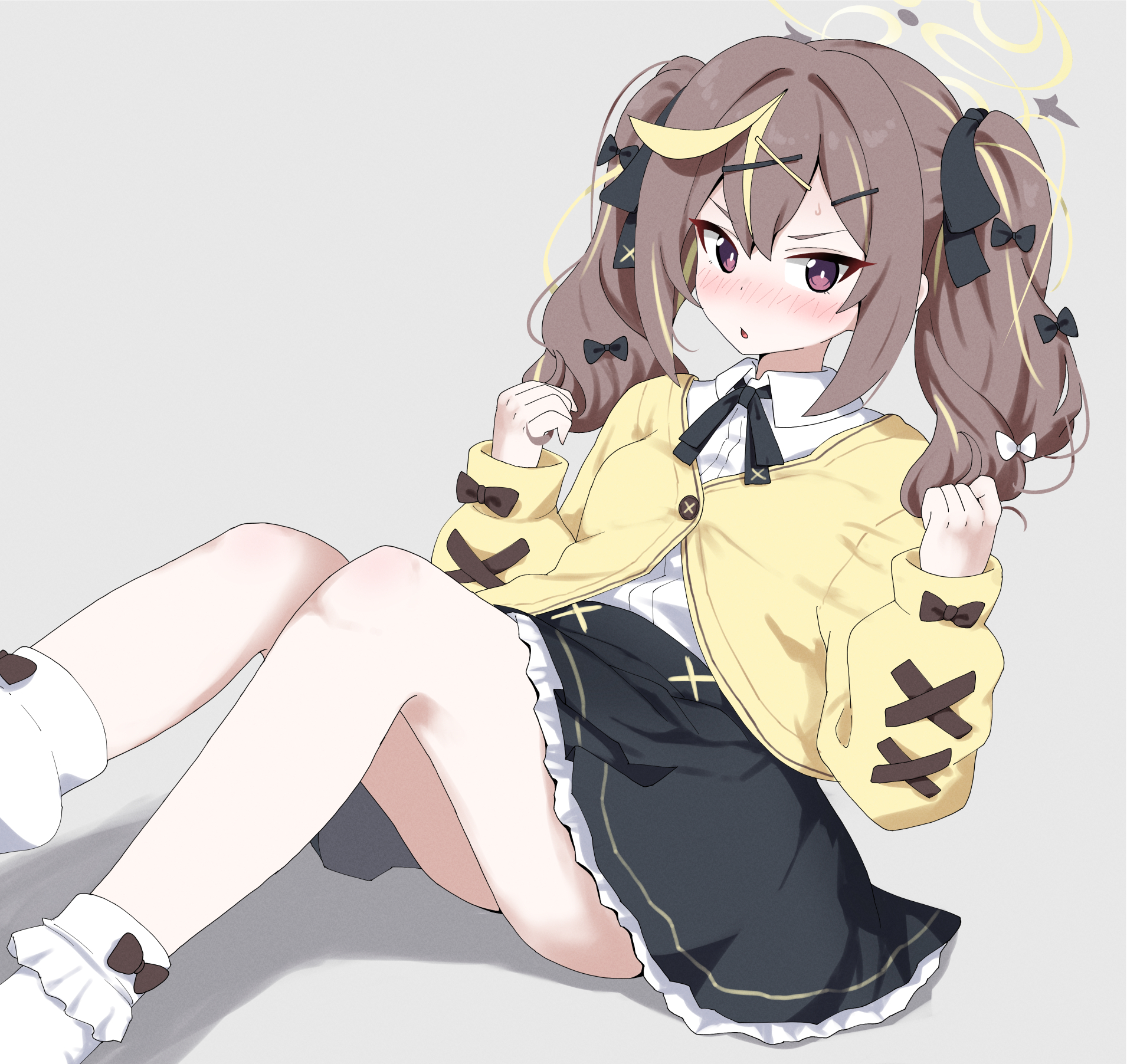 1girlblack skirtbowbrown haircardigangrey backgroundhair bowhalolong sleeveslooking at viewermulticolored hairpurple eyesshirtsimple backgroundskirtsockssolostreaked hairtwintailswhite shirtwhite socksyellow cardigan
