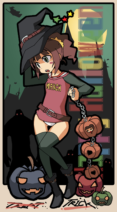 00s1girlbeltbootsbottomlessbrown hairfemale focusgreen eyeshalloweenhappy halloweenhatjack-o'-lanternno pantspantiespumpkinraglan sleevesshort hairsolothighhighstrick or treattwintailsunderwearwitch hat