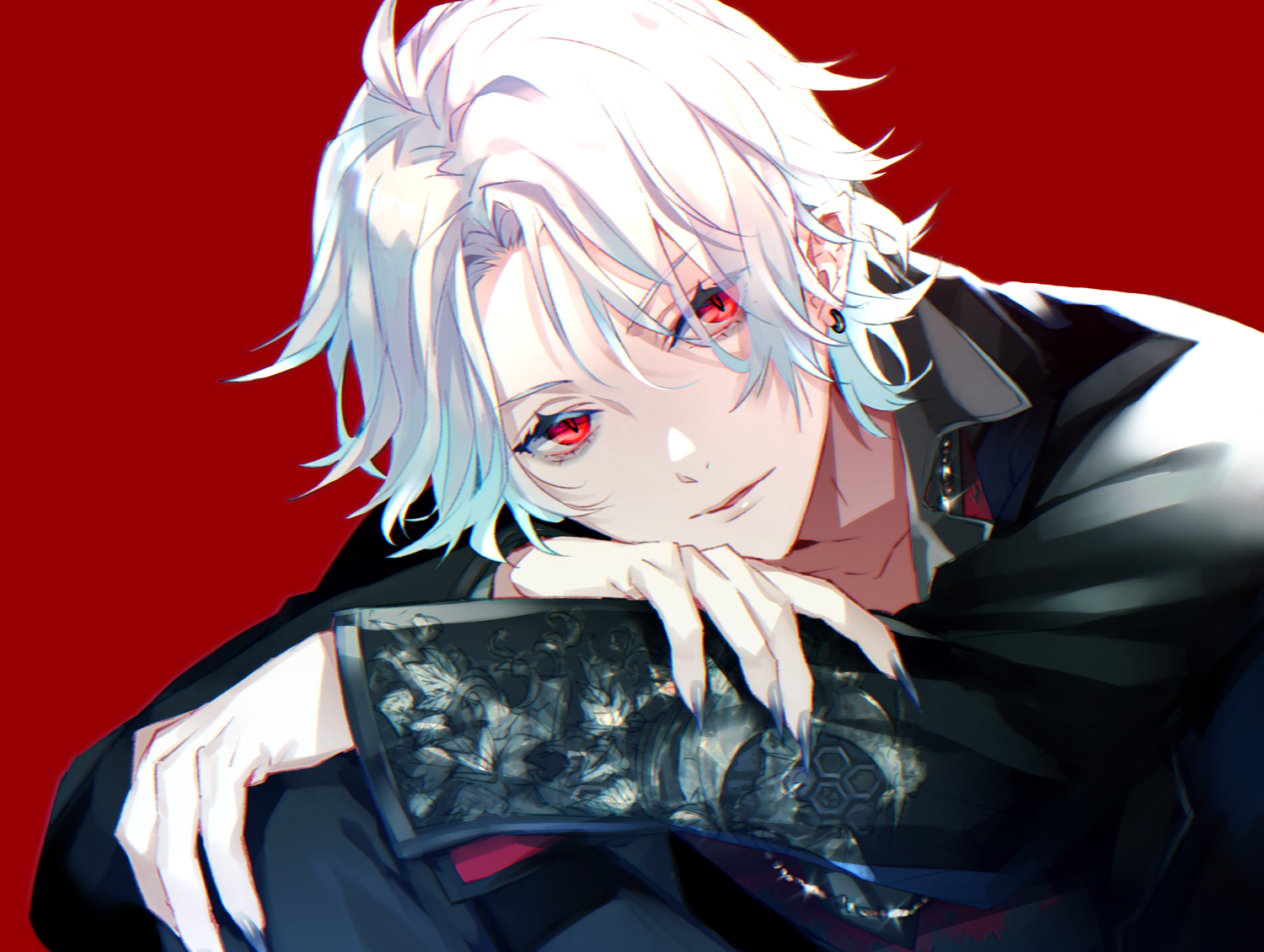 1boyahogeblack jacketblack nailsblack pantsblack shirtcollarbonecollared shirtear piercingearringseyelasheseyes visible through hairfingernailshair between eyeshead tiltjacketjewelrylong fingernailslong sleeveslooking at viewermale focusnail polishpantsparted bangsparted lipspiercingpointy earsred backgroundred eyessharp fingernailsshirtshort hairsimple backgroundsittingsoloupper bodyvirtual youtuberwhite hair