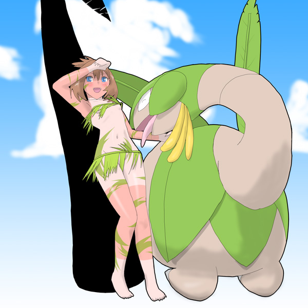 1girlaccessory tanbad anatomybad feetbad handsbikiniblue eyesblushbodypaintbreastsbrown hairclawsclouddayfangfangsgen 3 pokemonleafleaf bikininavelno brano headwearno pantiespokemon (creature)poorly drawnshirt tanshorts tanskysmall breastsswimsuittantanlinetanlinestongue
