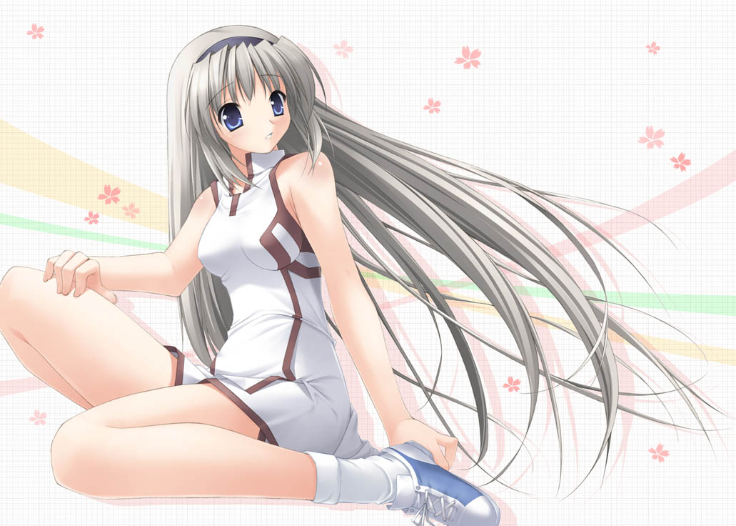 00sbare shouldersblue eyeshairbandlong hairshoessneakerssockssolosportsweartennis uniformvery long hair