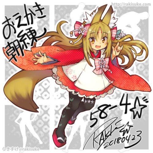 1girlanimal earsapronartist nameblack thighhighsblonde hairbootsbowbowtiedatedfox earsfox girlfox shadow puppetfox tailhair ribbonjapanese clotheskimonoofficial alternate costumeokoboopen mouthpink ribbonplatform sandalsred bootsred kimonored ribbonribbonsandalssignaturesolotailthighhighstwitter usernametwo-tone ribbonwatermarkweb addresswhite apronyellow eyes