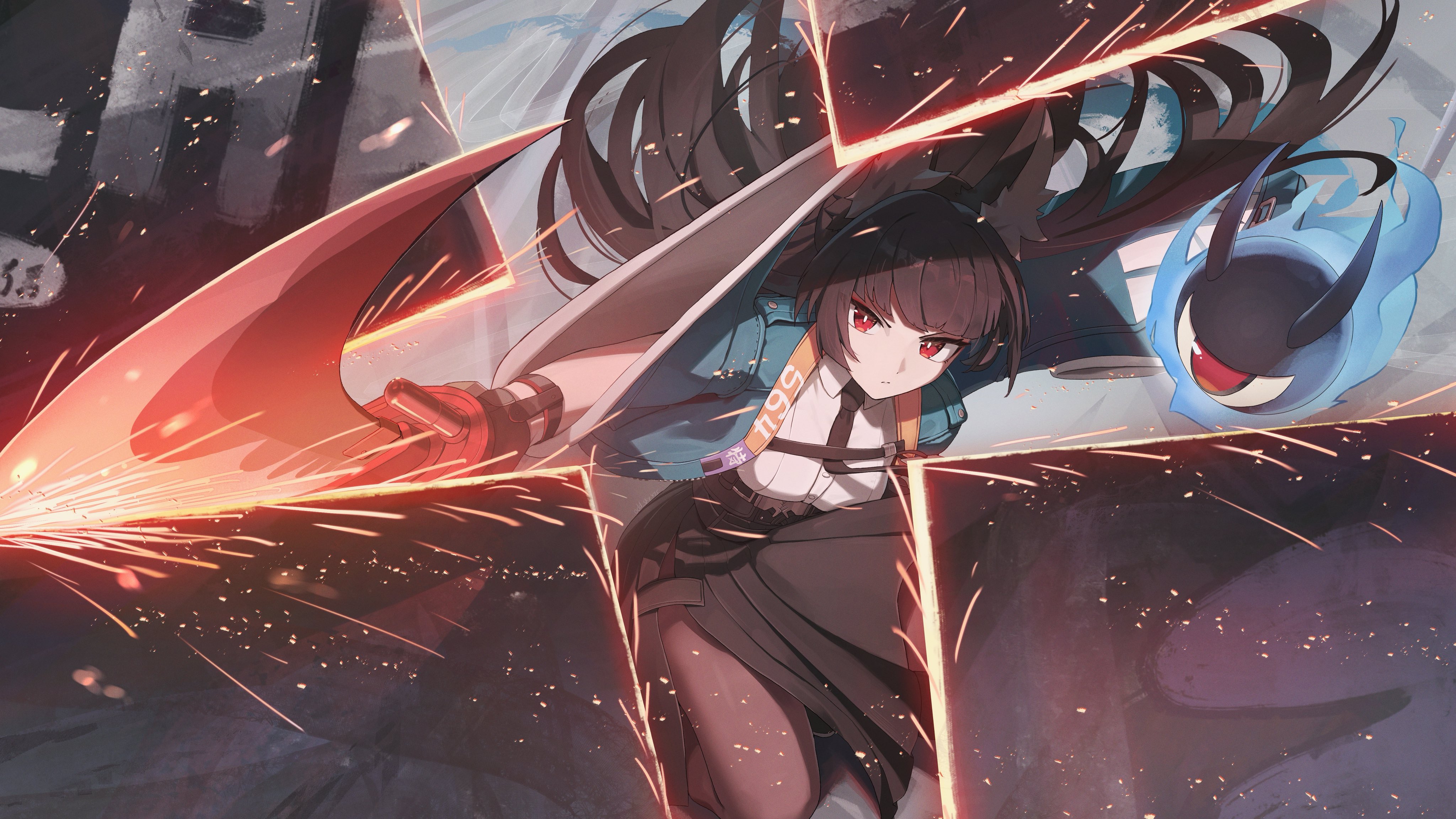 1girl1otheranimal ear fluffanimal earsaqua jacketbeltblack hairblack necktieblack pantyhoseblack skirtclosed mouthfingerless glovesfox earsfox girlglovesgreen jackethigh-waist skirtholdingholding swordholding weaponjacketkatanalong hairnecktiepantyhoseshirtsingle fingerless gloveskirtslashingsparkleswordweaponwhite shirt