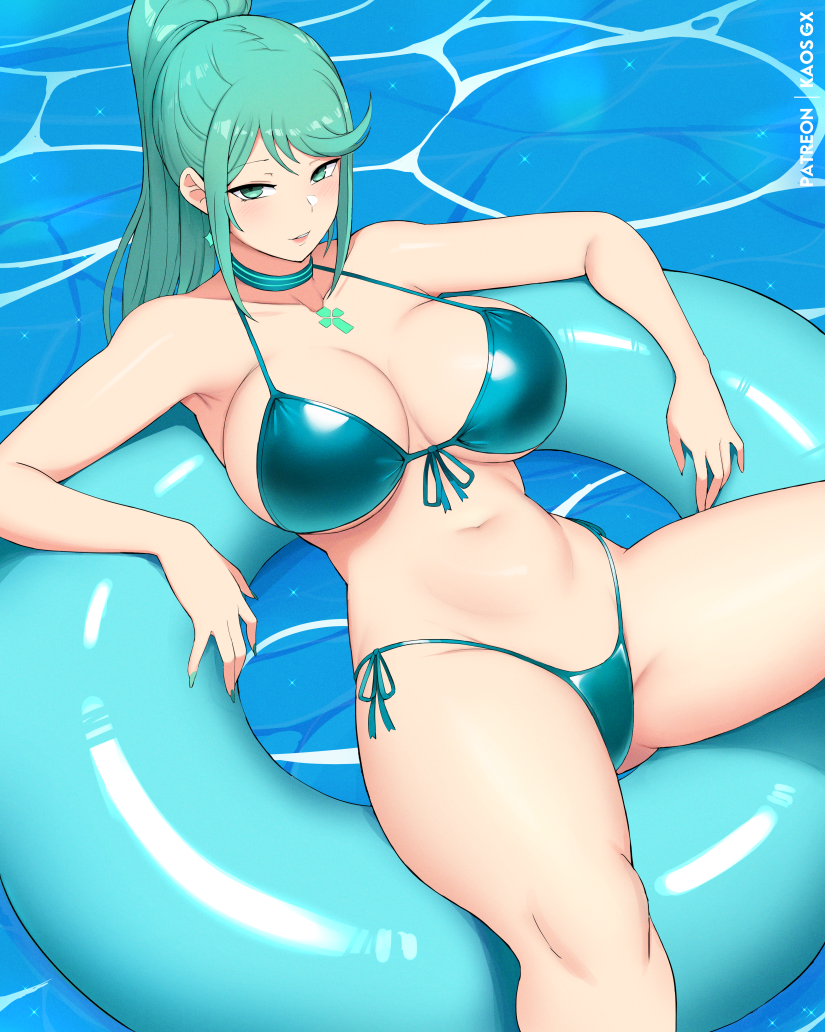 1girlafloatbare armsbare shouldersbikiniblushbreastschest jewelchokerfeet out of framefront-tie topgreen bikinigreen chokergreen eyesgreen hairgreen nailshighleghighleg bikiniinnertubelarge breastslong hairlooking at viewernail polishnavelparted lipspatreon usernameponytailside-tie bikini bottomsolosparklespread legsstring bikiniswim ringswimsuitvery long fingernailswater