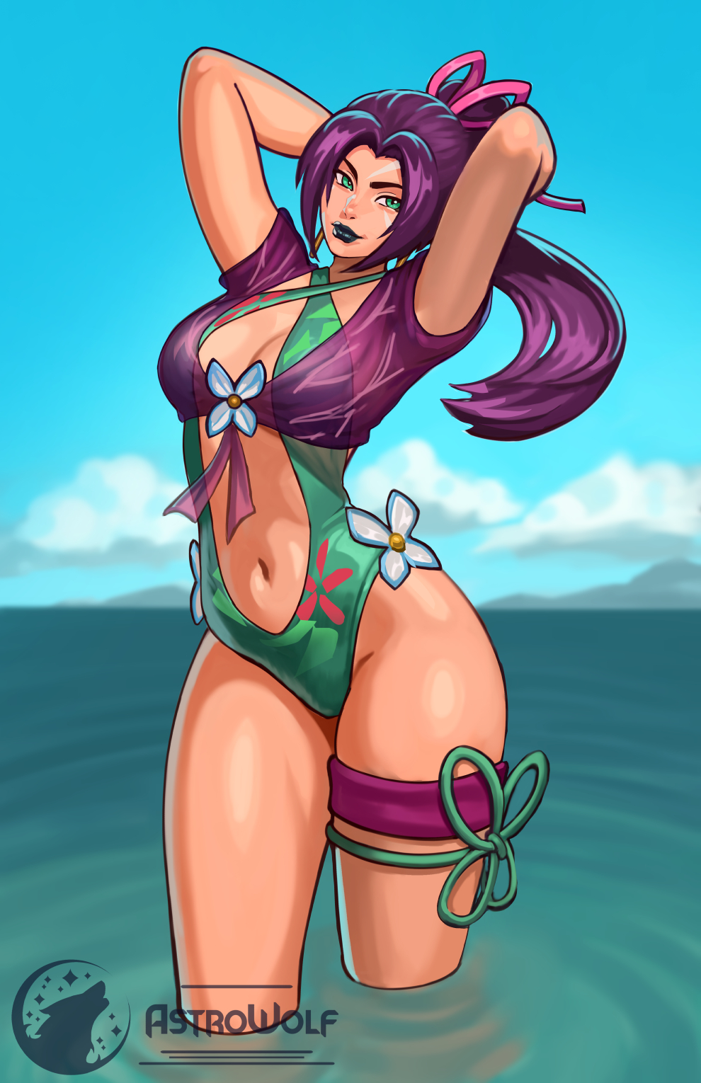 1girlbreastsbutterfly ornamentcleavagegreen lipsgreen one-piece swimsuithair ribbonlarge breastslong hairlooking at viewernavelofficial alternate costumeone-piece swimsuitponytailpurple hairribbonsmilesoloswimsuitwater