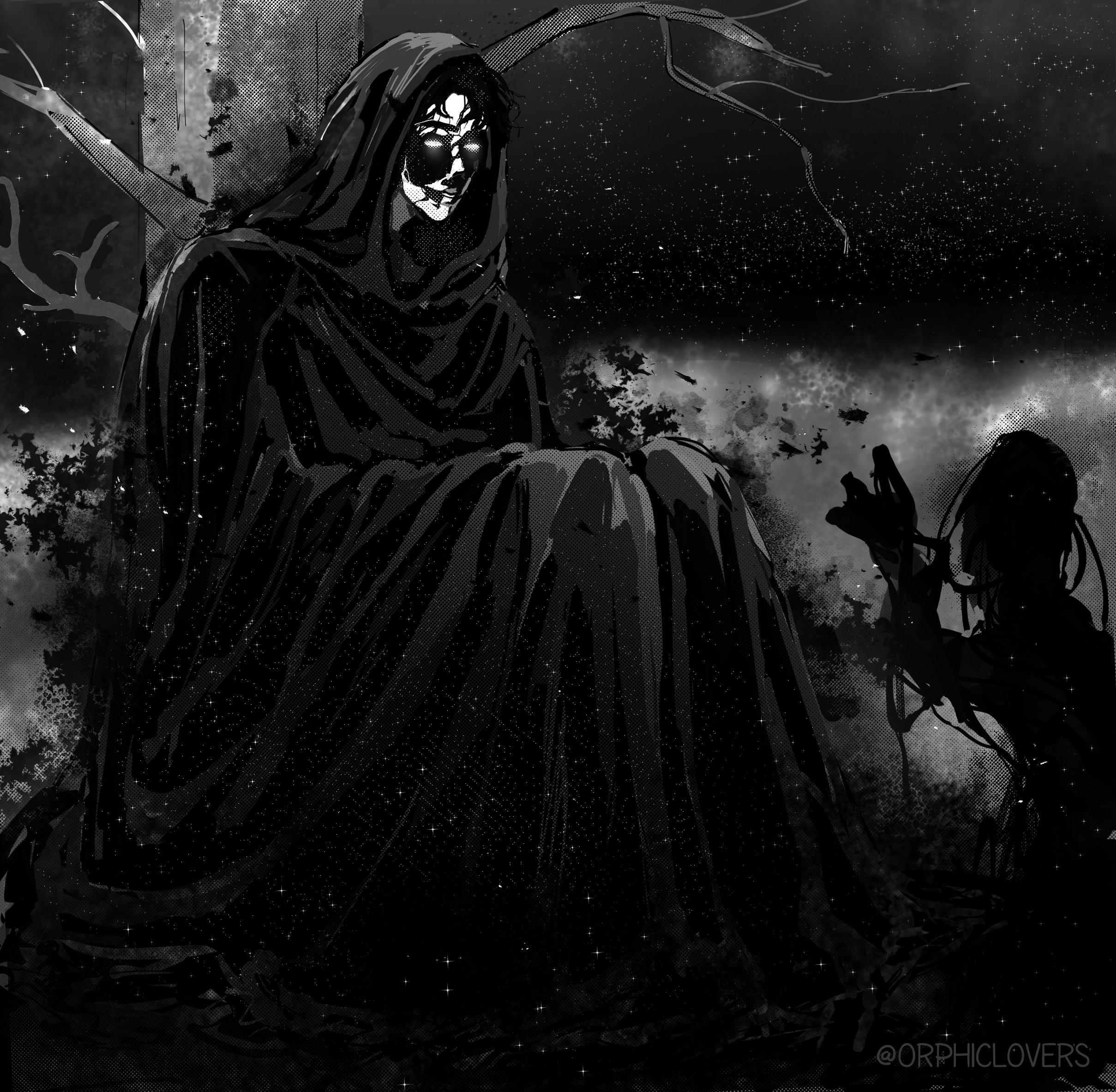 1otherbare treeblack haircloakcracked skindarkempty eyesexposed boneglowingglowing eyesgreyscalehalftonehoodhood uphooded cloakknees upmonochromeorphicloverspartially shaded faceplantporcelainshort hairsilhouettesittingsmilesnowsolosymbolismtreevines