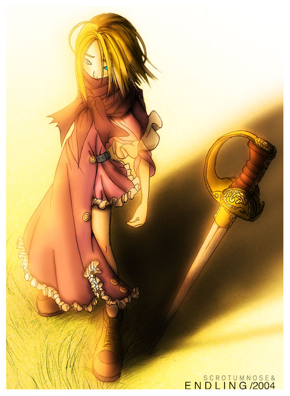 1girlasymmetrical clothesblue eyesbrown hairdressfemale focusfrillsfull bodynatureoutdoorsshort hairsoloswordweapon