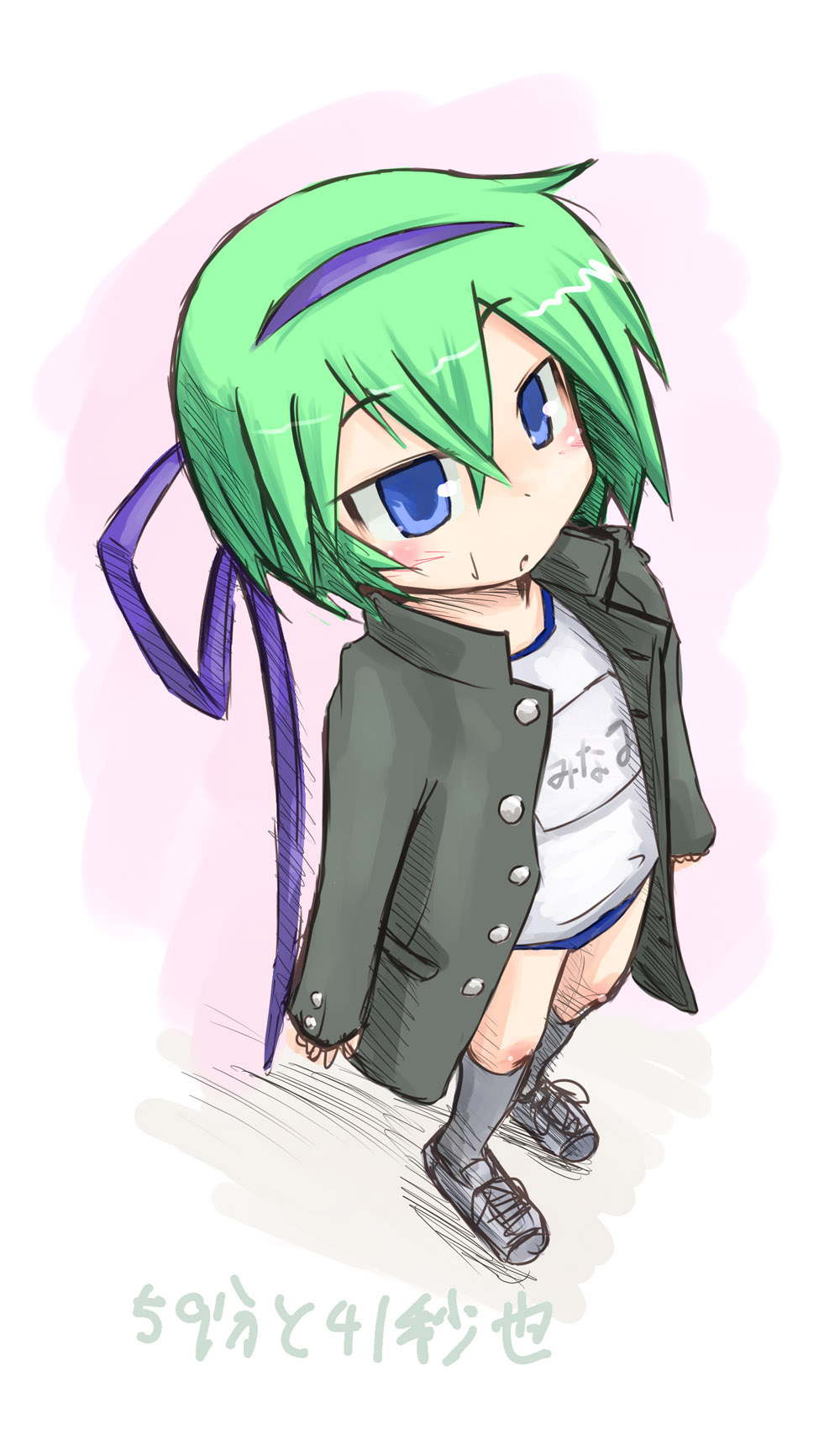 00sblue eyesburumacoatgreen hairgym uniformhairbandone-piece swimsuitschool swimsuitshort hairsolostandingswimsuitwhite one-piece swimsuitwhite school swimsuit