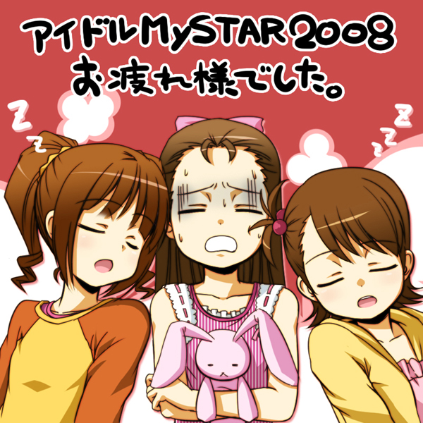 kiriman (souldeep), original, 3girls, armpits, arms up, bare legs, bare shoulders, breasts, buttons, chemise, cleavage, closed eyes, collarbone, flat chest, from side, head tilt, lying, multiple girls, on back, on bed, parted lips, pillow, sleeping, sleeveless, small breasts, smile, upper body