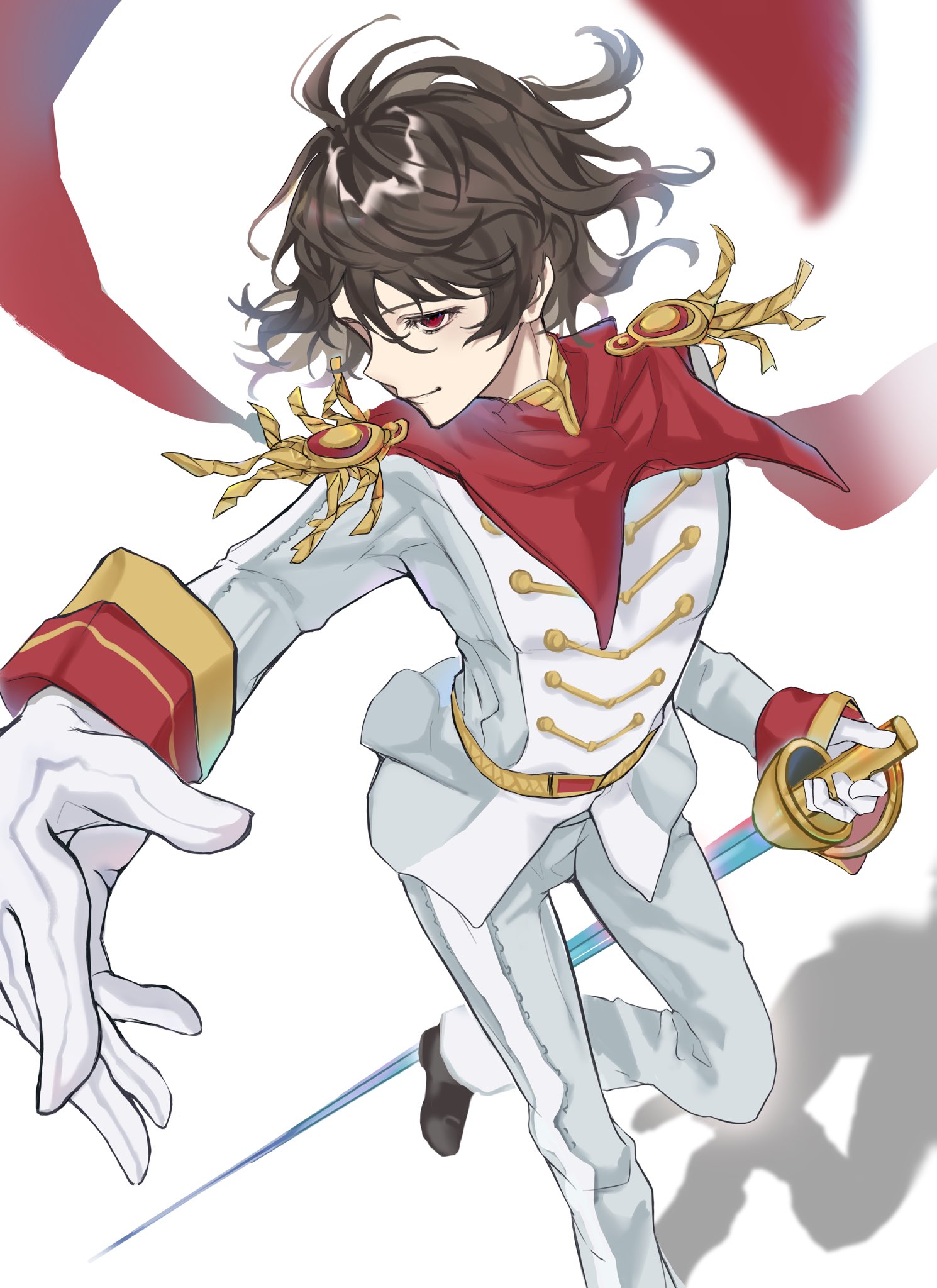 1boyadumi231ahogebrown hairbrown shoescapeclosed mouthepaulettesfloating hairfoot out of frameglovesgold belthair between eyesholdingholding swordholding weaponjacketleft-handedlong sleeveslooking to the sidemale focusmedium hairno maskoutstretched armpantsred capered eyesreverse gripshadowshoessmilesoloswordweaponwhite gloveswhite jacketwhite pants