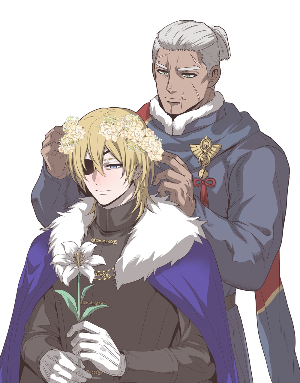 2boysarms upblack shirtblonde hairblue capeblue eyescapedark skindark-skinned maleeyepatchflowerflower wreathfur trimfur-trimmed capefur-trimmed collarglovesgreen eyeshair between eyesholdingholding flowerlong sleevesmale focusmultiple boysmultiple scarsone eye coveredparted bangsponytailscarscar on facescar on mouthscarfshirtshort hairshort ponytailsimple backgroundwhite backgroundwhite flowerwhite furwhite gloveswhite hair