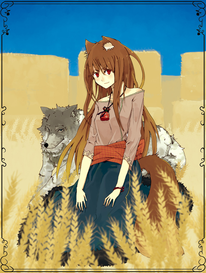 00s1girlanimal earsbare shouldersbraceletbrown hairjewelrylong hairnecklacered eyessashskirtsmiletailwolfwolf earswolf tail
