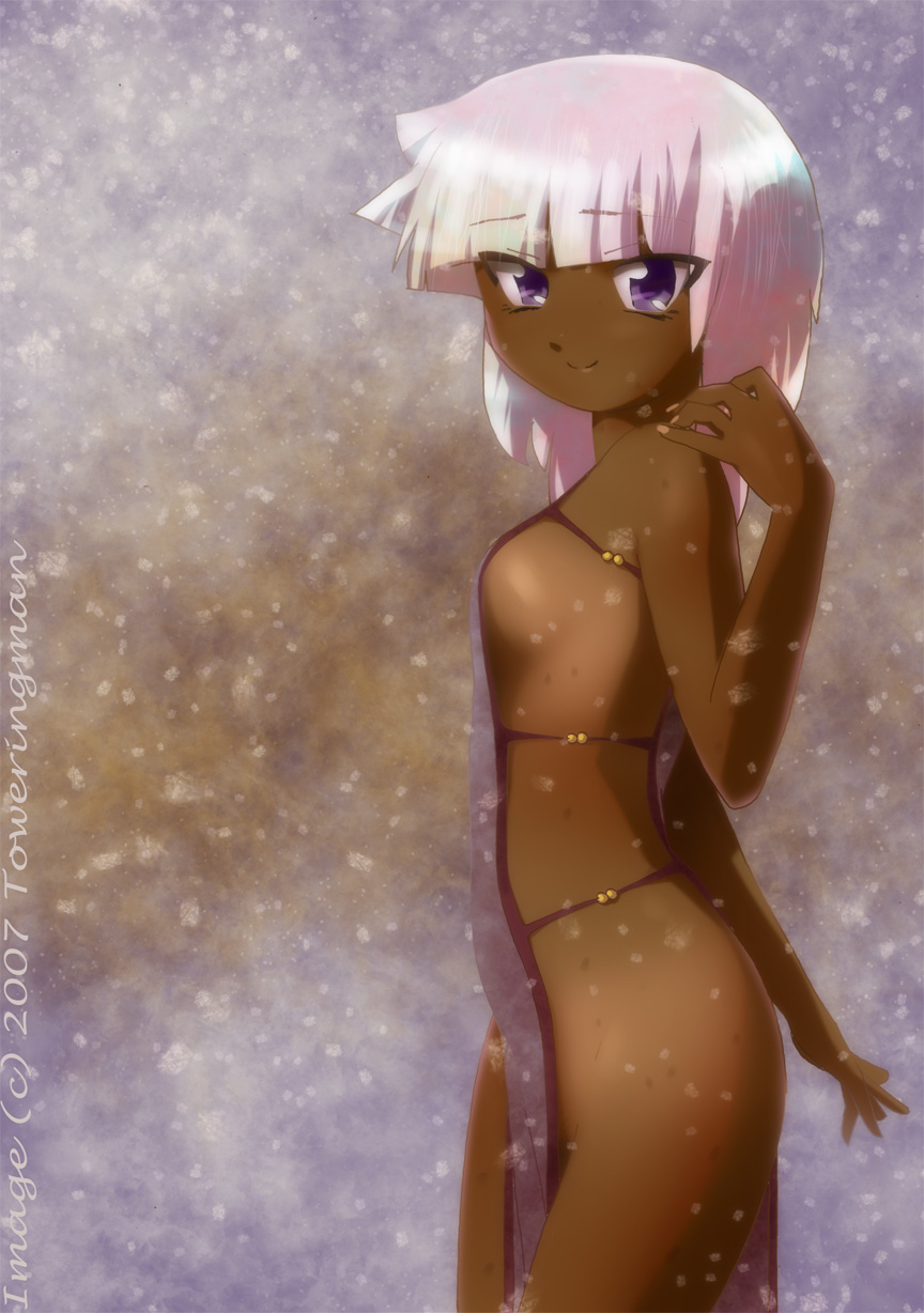 katina tarask, banpresto, super robot wars, super robot wars original generation, lowres, 1girl, bikini, blonde hair, breasts, cleavage, female focus, food, green eyes, hat, heterochromia, large breasts, orange bikini, popsicle, red eyes, solo, straw hat, swimsuit, wind chime