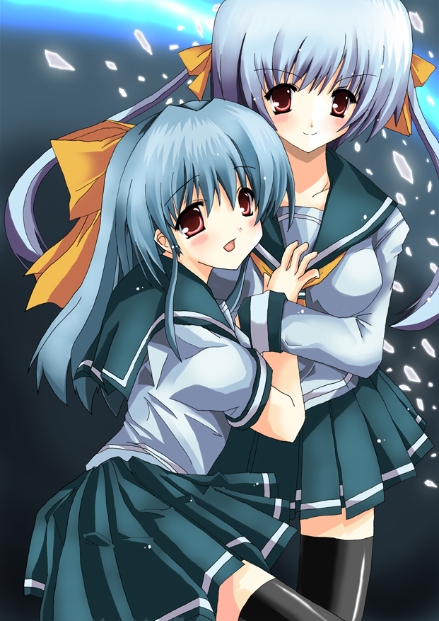 2girlsblushbowhair bowhair ribbonlong hairmultiple girlsopen mouthred eyesribbonschool uniformserafukuskirtthighhighszettai ryouiki