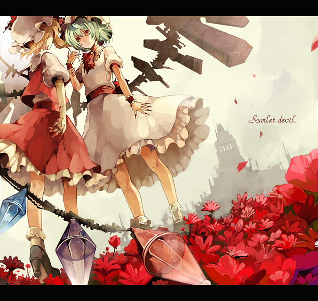 2girlsascotblonde hairbloodblue hairfemale focusfingernailsflowerfrilled skirtfrillshathat ribbonletterboxedlong fingernailslooking at anothermob capmultiple girlsoutdoorspuffy short sleevespuffy sleevesred eyesribbonshoesshort hairshort sleevessiblingssistersskirtsockstext focuswingswrist cuffs