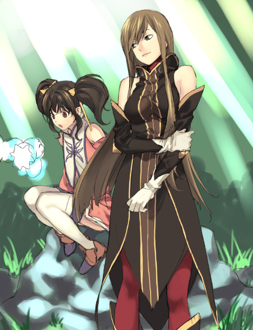 00s2girlsblack hairbrown eyesbrown hairglovesgreen eyeslong hairmultiple girlsribbonsmiletwintails