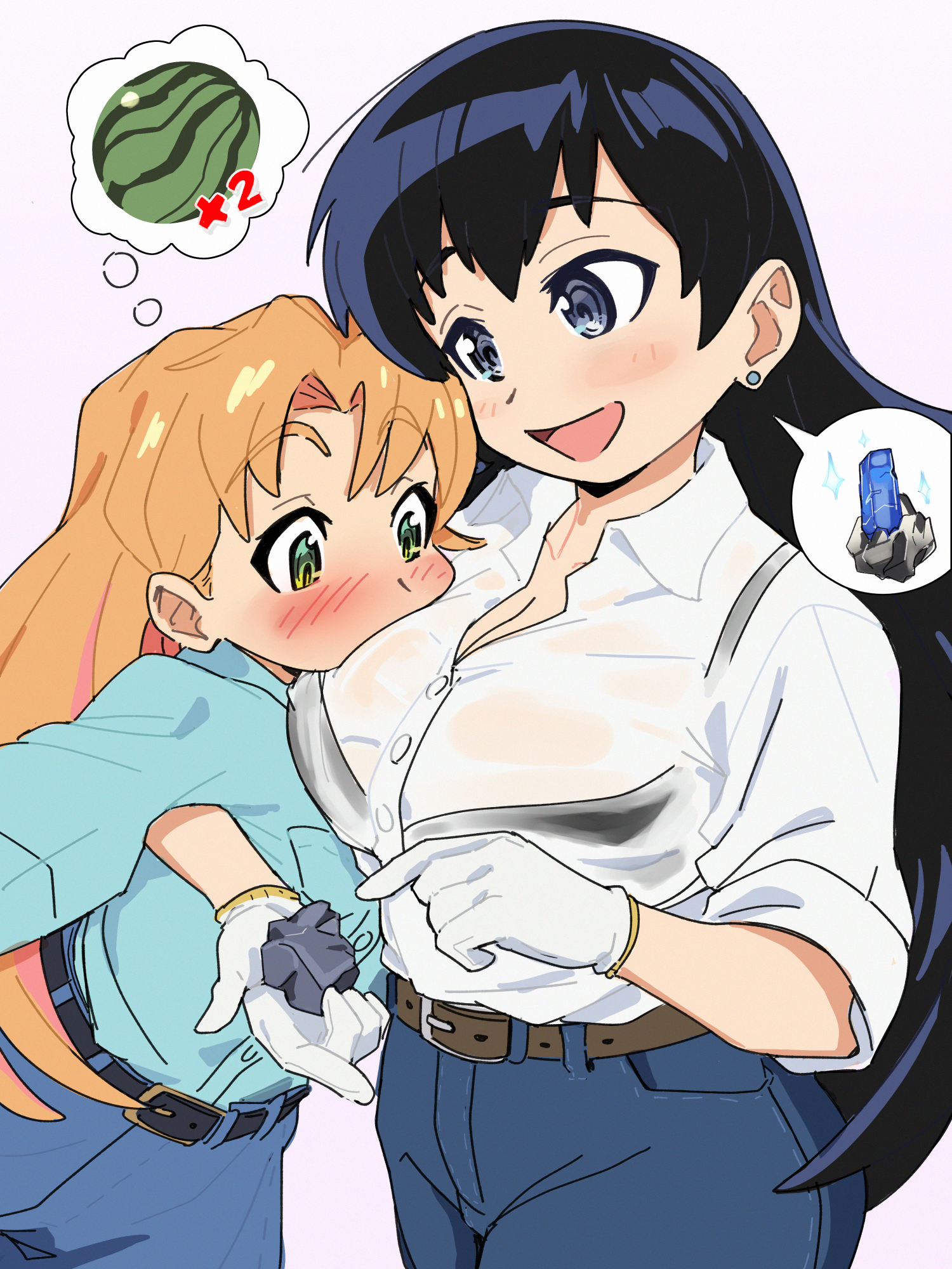 :d2girlsage differencearm around neckbeltblack brablack eyesblack hairblue shirtblushbrabra visible through clothesdenimdress shirtearringsfoodfruitgemglovesgreen eyesjeansjewelrylong hairlooking at anothermultiple girlsopen mouthorange hairpantspointingrocksee-through clothessee-through shirtshirtsimple backgroundsleeves rolled upsmilespeech bubblespoken objectstandingstud earringsthought bubbleunderwearvery long hairwatermelonwetwet clotheswet shirtwhite gloveswhite shirtwing collaryuri