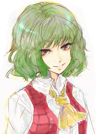 1girlascotfemale focusgreen hairplaid clothesplaid vestred eyesshikaishort hairsmilesoloupper bodyvestwhite background