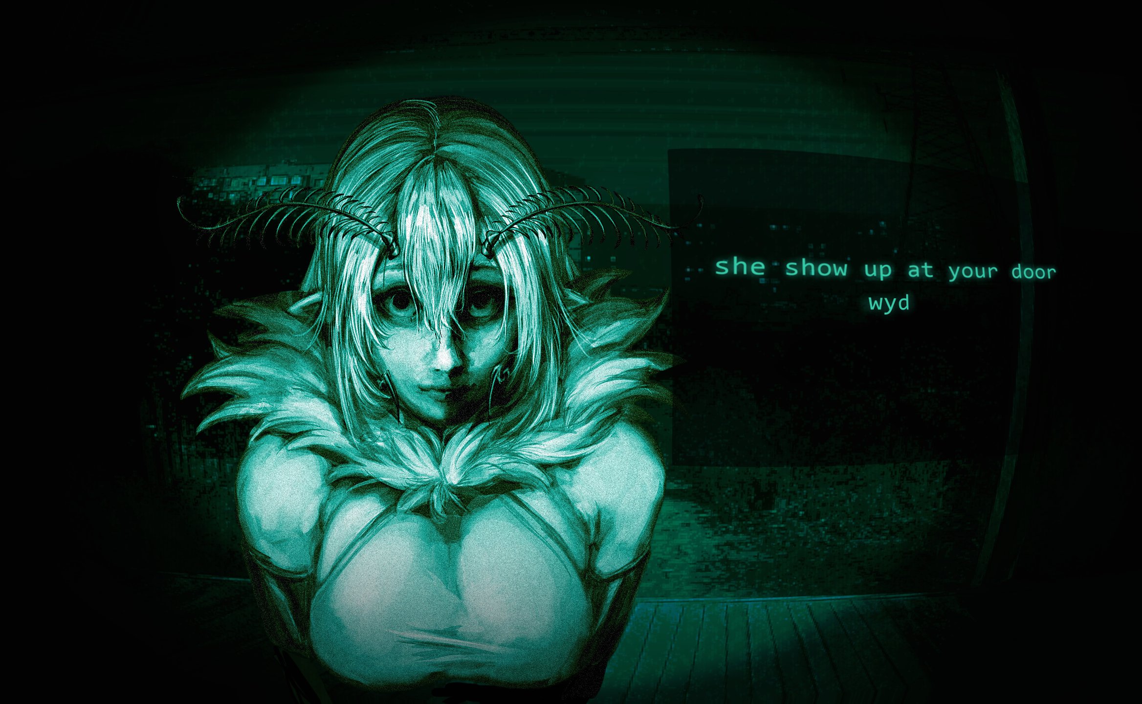 1girlantennaearthropod girlblack sclerabreastscolored scleradarkenglish textgreen themehorror (theme)insect girllarge breastslong hairlooking at viewermonster girlmoth antennaemoth girlno i'm not a humanpointy earspov peepholesolovirtual youtuberwhite hair