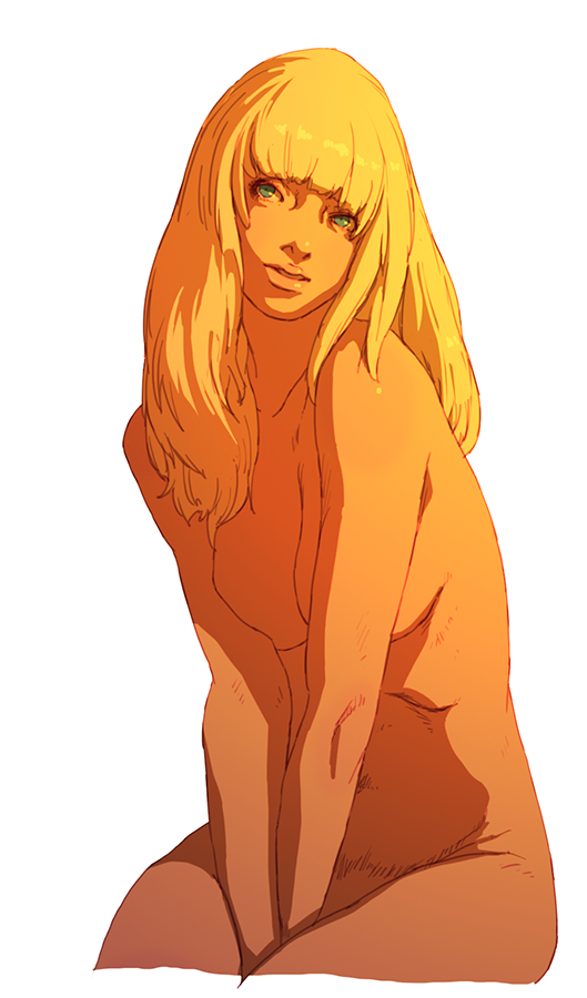 1girlblonde hairblunt bangsbreastscovering privatesgreen eyeshatching (texture)large breastslong hairnudeparted lipssimple backgroundsolowhite background