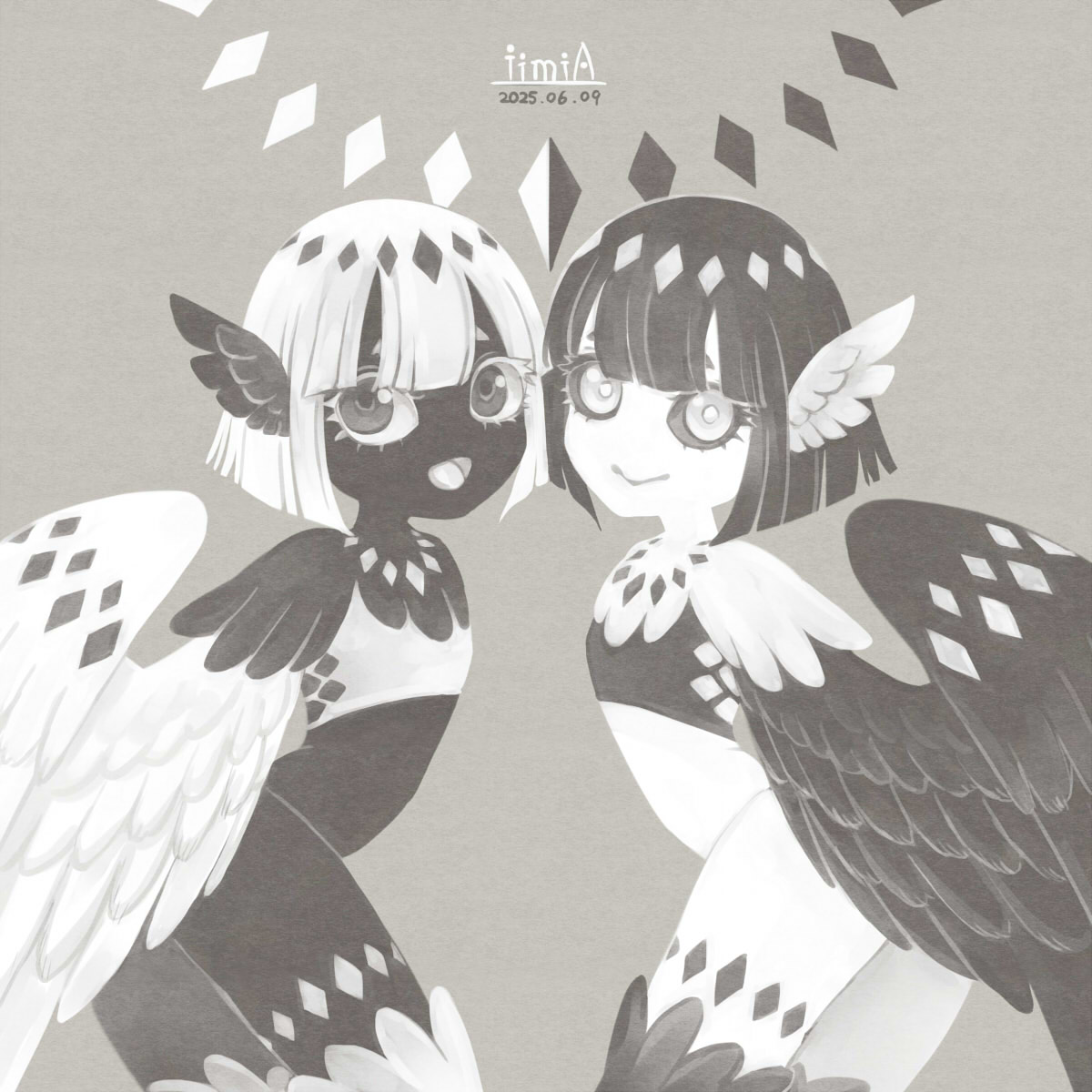 2girlsartist namebird legsblack eyesblack feathersblack hairblack sclerablack skinblack wingsblunt bangscolored scleracolored skindatedfeathered wingsfeathersflat chestharpyhead wingslooking at viewermonster girlmultiple girlsopen mouthshort hairsiblingssimple backgroundsmiletwinswhite eyeswhite featherswhite hairwhite skinwhite wingswinged armswings