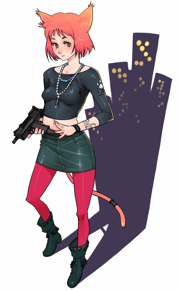 1girlanimal earsbootsbreastscat earscat tailfemale focusgunimpossible clothesimpossible shirtjewelrymac-10/11medium breastsmidriffmolemole under eyenecklaceorange hairpantyhosered hairshirtshort hairskirtsolosubmachine guntailweaponyellow eyes
