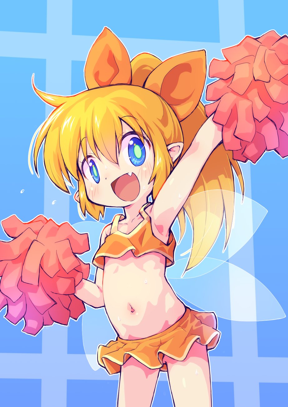 1girlarm uparmpitsblonde hairblue eyescheerleaderfairyfairy wingsfanglong hairmicroskirtnavelopen mouthorange pantiesorange ribbonorange shirtorange skirtpantiespanty peekpointy earspom pom (cheerleading)ponytailribbonshirtskirtsleevelesssleeveless shirtsmilesolostomachthighsunderwearwings