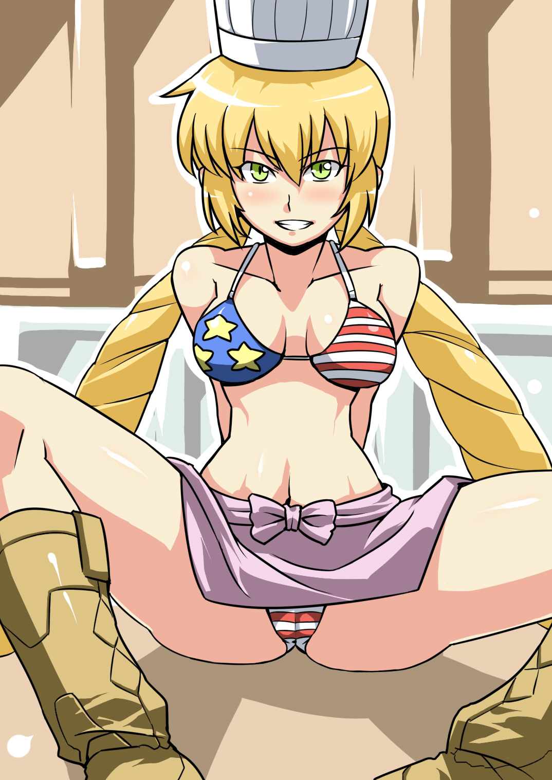 00s1girlamerican flagamerican flag bikiniamerican flag printapronbeaniebikiniblonde hairbootschef hatfemale focusflag printflag print bikinigreen eyeshatprint bikinisolospread legsswimsuittoque blanchetwintailsunited states