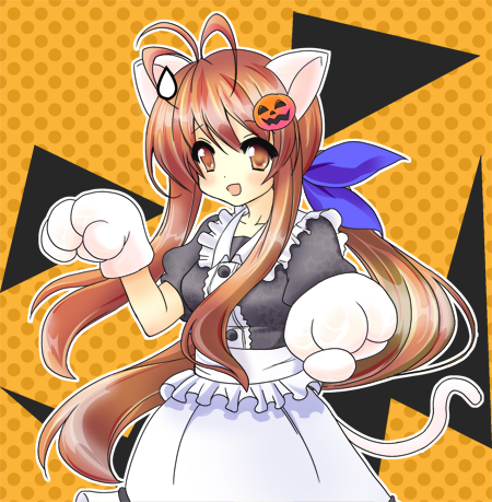 00s1girlanimal earsanimal handsantenna hairbrown eyesbrown haircat earscat pawscat tailfemale focusfood-themed hair ornamenthair ornamenthalloweenjack-o'-lanternlong hairmaidorange backgroundpumpkinpumpkin hair ornamentsolosweatdroptail