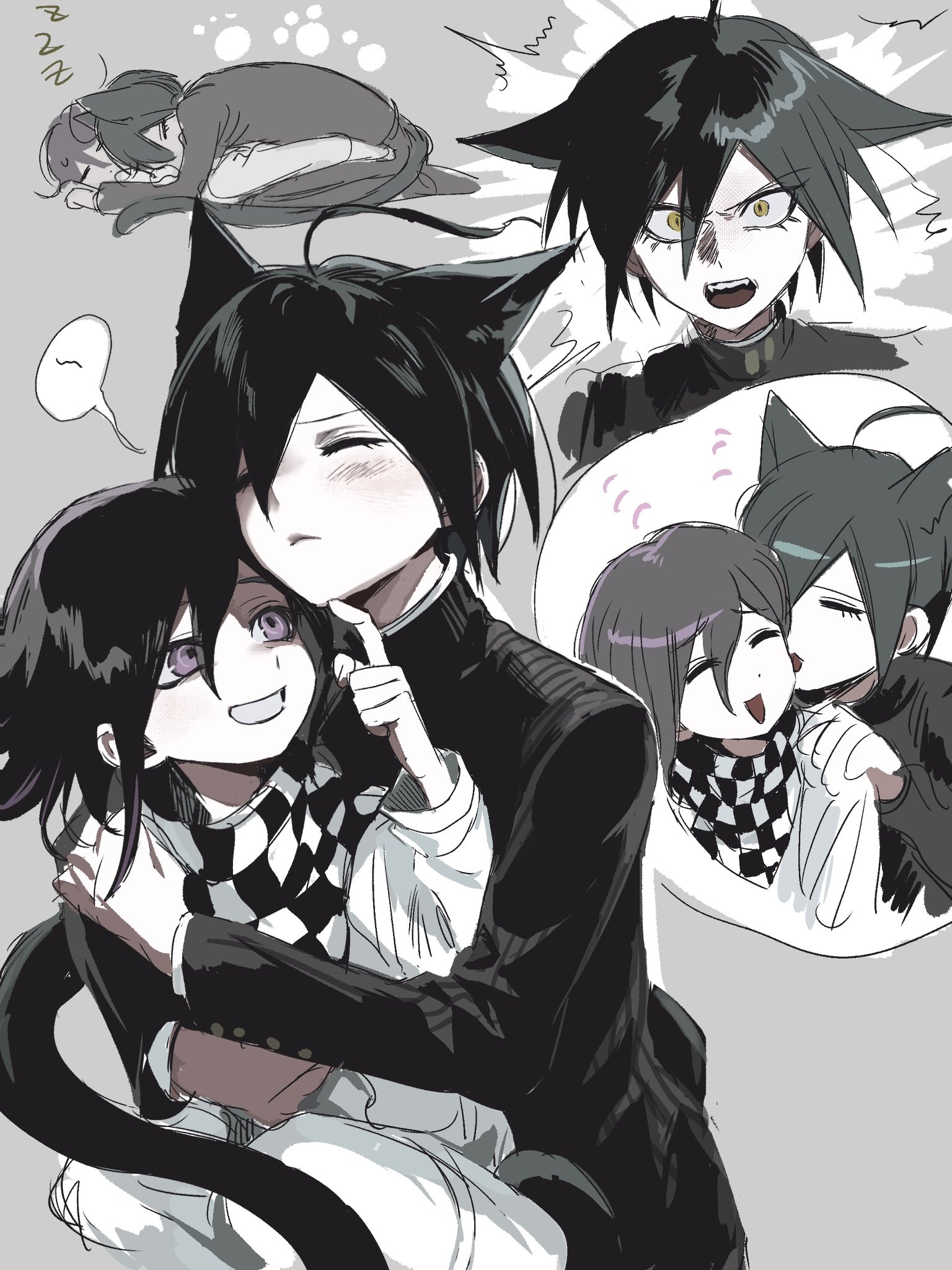 2boysaffectionateanimal earsblack hairblack jacketblushbuttonscat boycat earscheckered clothescheckered scarfcuddlingeyelashesfangsflipped hairgrey backgroundgrey themehair between eyeshughug from behindjacketlickinglicking another's cheeklicking another's facelong sleevesmale focusmonochromemultiple boysmuted colorpaw printpurple eyespurple hairscarfscratching chinshort hairsimple backgroundsleepingsmilesquattingstriped clothesstriped jackettwo-tone scarfusagi mi nagiwide-eyedyaoizzz