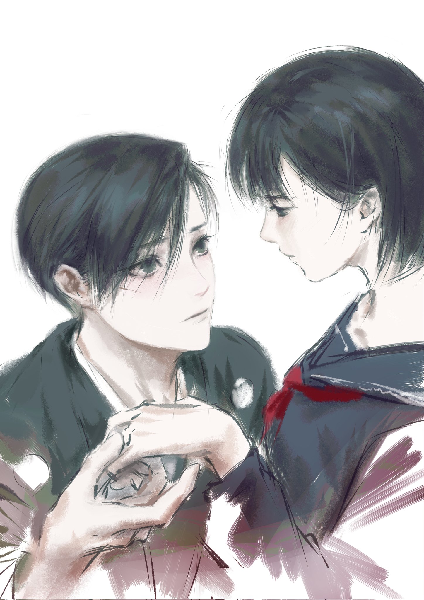 iwashi (wawaisi iwasi), adachi rei, tsukumo shion, a.i. voice, utau, absurdres, highres, 2girls, :3, black dress, black shirt, blue background, closed mouth, cowboy shot, dress, floral background, from side, gloves, grey gloves, grey jacket, grey skirt, hair ribbon, headlamp, hood, hooded jacket, jacket, long hair, long sleeves, looking at viewer, looking to the side, medium hair, multiple girls, orange eyes, orange hair, outside border, pillarboxed, playing with another's hair, purple eyes, purple hair, ribbon, shirt, skirt, smile, upside-down