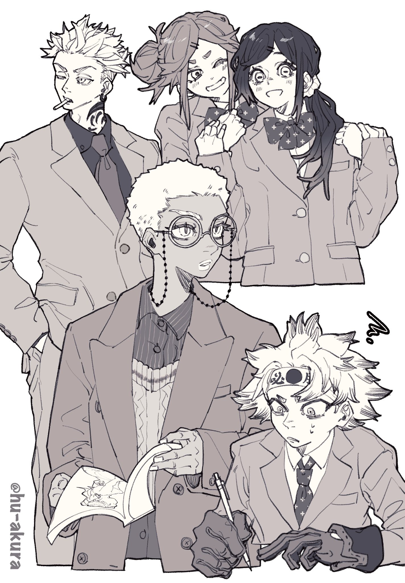 2boys3girlsbowbowtiecollared shirtdark skindark-skinned femaleformal clothesglassesglovesgreyscalehands upheadbandhu akurajacketlapelslong sleeveslow ponytailmessy hairmonochromemultiple boysmultiple girlsnecktienotched lapelsponytailshirtshort hairsuitsweatervery short hair