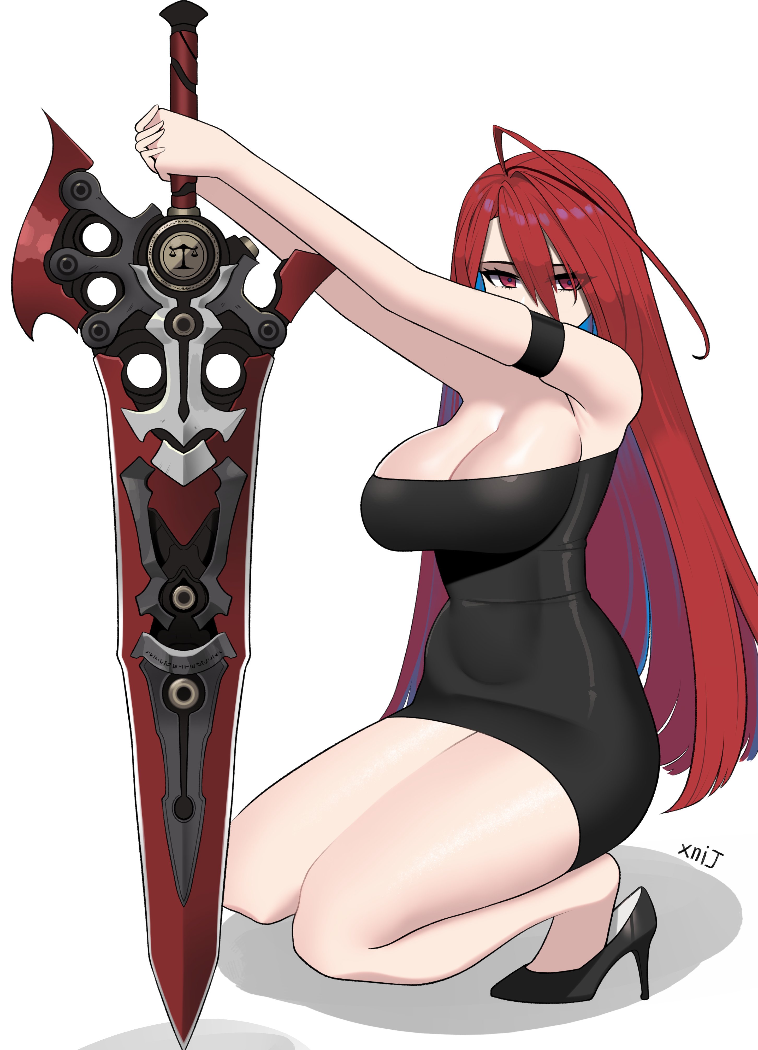 1girlahogeblack dressblue hairbreastscolored inner hairdressgreatswordhigh heelsholdingholding weaponhuge ahogelarge breastslong hairlooking at viewermulticolored hairplantedplanted swordplanted weaponred eyesred hairsimple backgroundsoloswordthorn (elizabeth rose bloodflame)two-tone hairvery long hairvirtual youtuberweaponwhite background