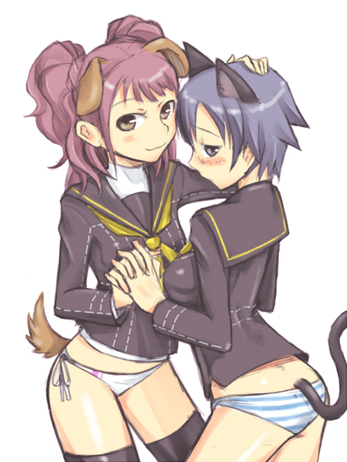 2girlsanimal earsblack serafukublue eyesblue hairblushbrown eyescatcat earscat taildogdog earshand on another's headholding handsmultiple girlsno pantspantiespink hairschool uniformserafukushort hairside-tie pantiesstriped clothesstriped pantiestailthighhighstwintailsunderwearwhite pantiesyuri