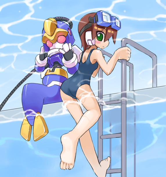 2girlsassbackbare shouldersbarefootblushblush stickersbrown haircablecausticsfeetfrom behindgogglesgoggles on headgreen eyesladderlooking backmermaidmonster girlmultiple girlsone-piece swimsuitpoolpool ladderschool swimsuitshort hairsittingsolesswimsuitunderwaterwadingwater