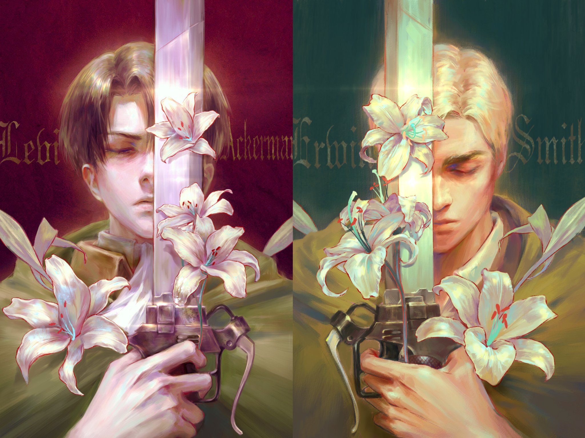 2boysascotblack hairblonde haircharacter namecloakclosed eyesclosed mouthcollared shirtflowergreen backgroundgreen cloakhair between eyesholdingholding swordholding weaponleaflily (flower)male focusmultiple boysone eye coveredparted bangsplantred backgroundshirtshort hairswordthick eyebrowsthree-dimensional maneuver gearupper bodyweaponwhite ascotwhite flowerwhite shirtyellow cloak