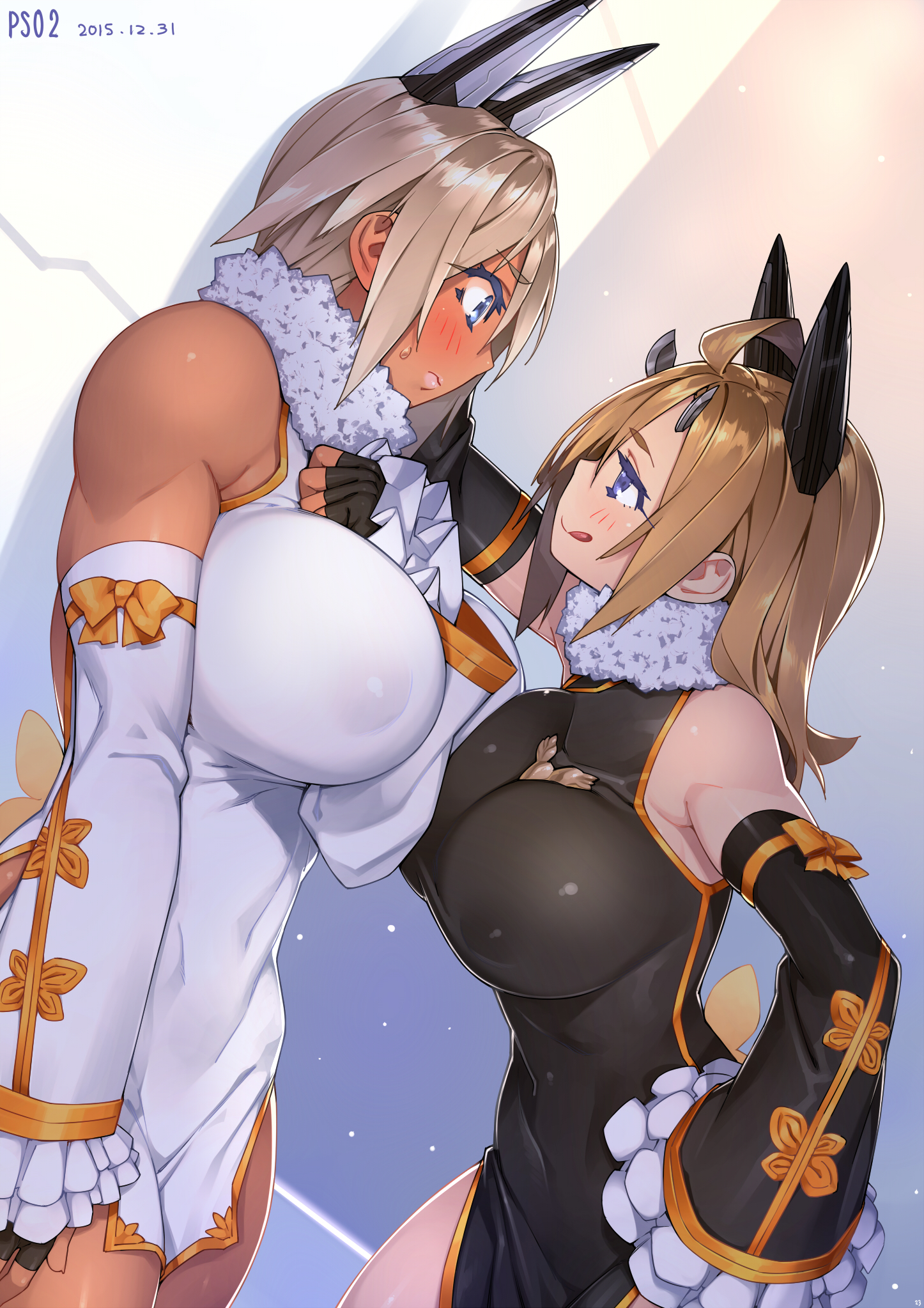 2girlsblonde hairblue eyesblushbreastsbrown hairdark skindresserect nipplesfemaleFlag for Deletionheadgearlarge breastslicking lipslong hairmultiple girlsshort hairsleevesstandingsweatdrop